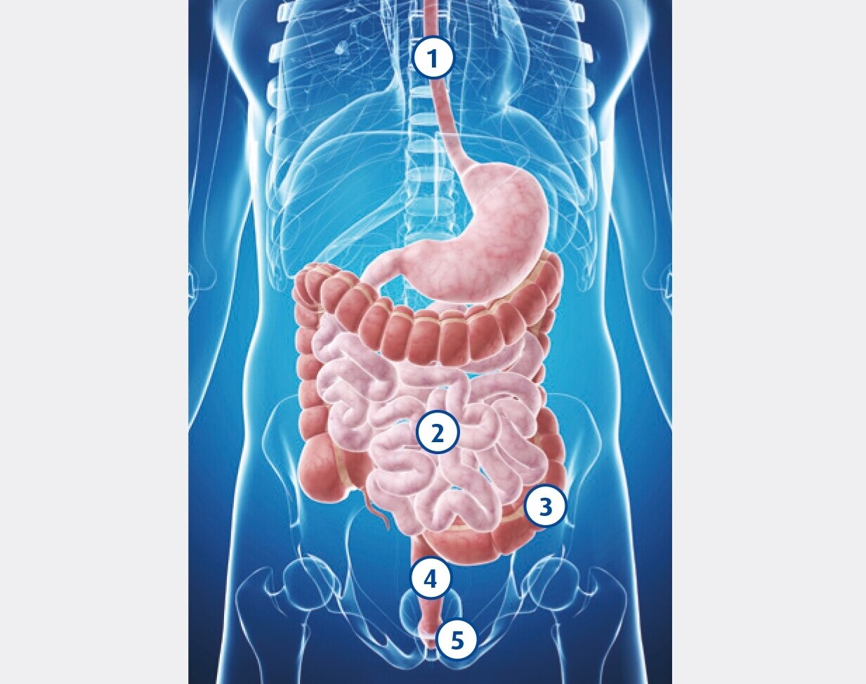 1 - Esófago; 2 - Intestino delgado; 3 - Intestino grosso; 4 - Reto; 5 - Anus